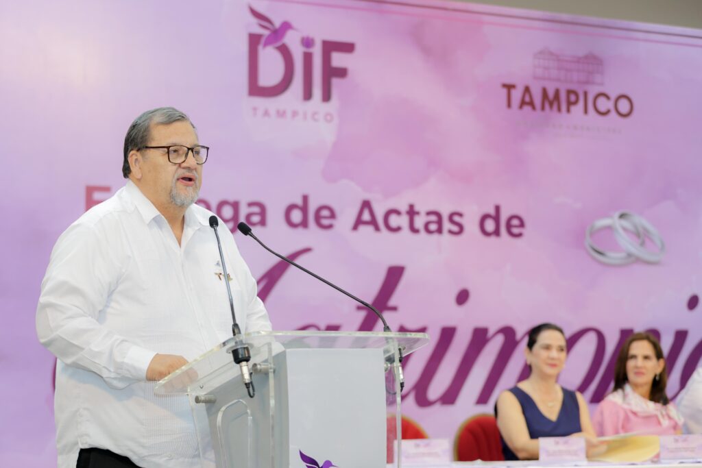 En el acto efectuado en la Casa de la Cultura de Tampico, 85 parejas obtuvieron su certificado de matrimonio, en un evento donde reinó un gran ambiente amenizado por mariachi, música de cámara y la felicidad de los contrayentes y sus familiares.